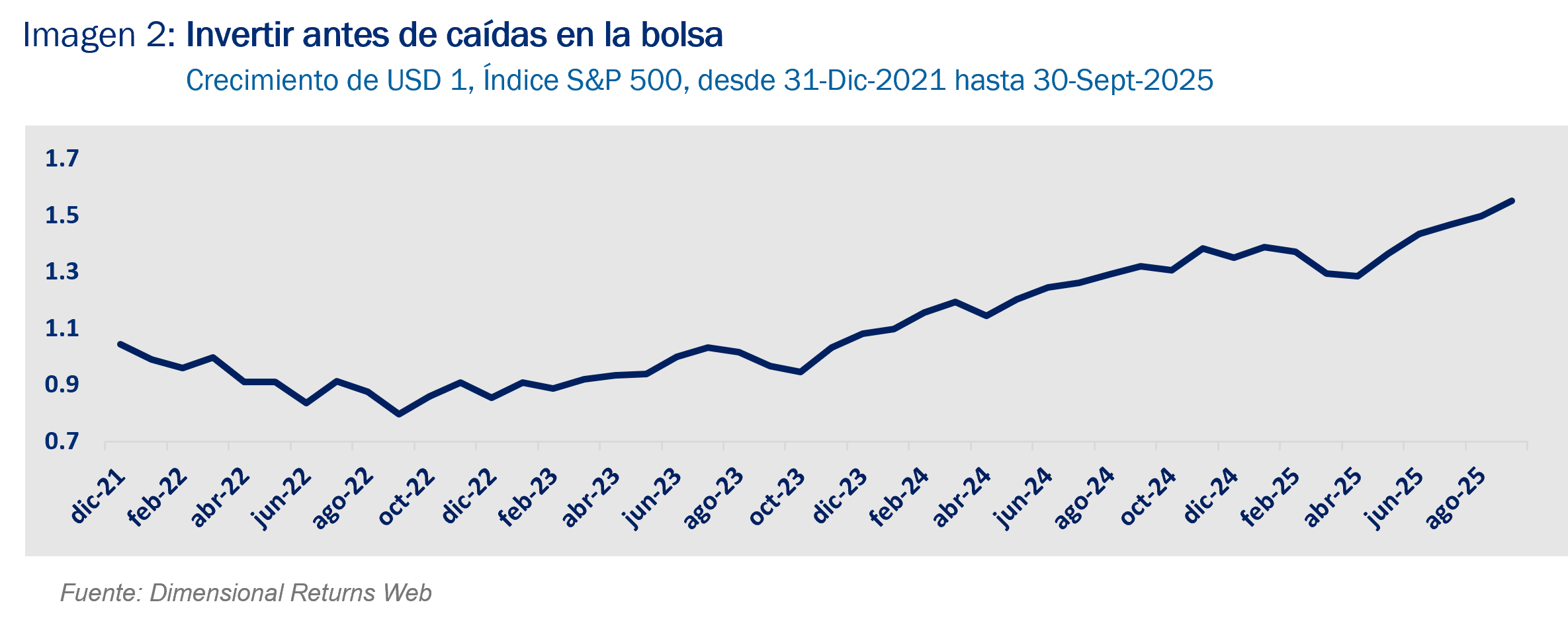 Pero incluso en los casos en que los máximos históricos fueron seguidos por caídas -como el de diciembre de 2021, la información empírica refleja que actualmente alcanzamos otro récord histórico. Por lo tanto, y pese a la baja del índice a principios de 2022, quienes invirtieron en diciembre de 2021 obtuvieron una rentabilidad anualizada de un 12,13% (imagen 2).
