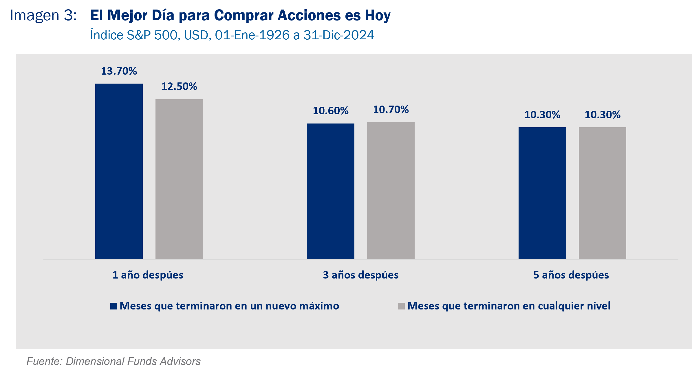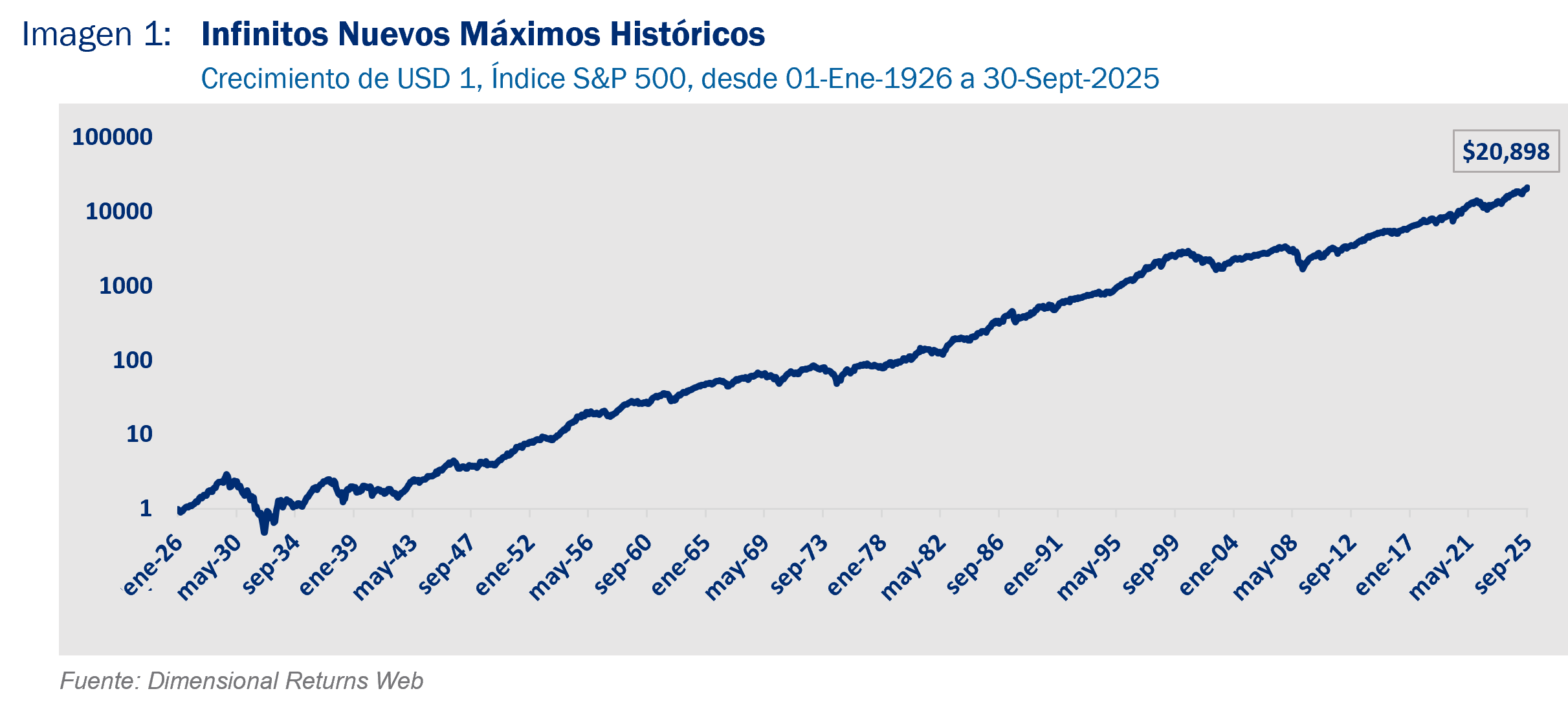 Para dar mayor sustento a lo que le mencionamos, tomemos un análisis hecho por Dimensional respecto al desempeño del S&P 500 durante los 99 años que finalizaron en 2024. El estudio reveló que el índice produjo un nuevo máximo -en su acumulación de riqueza- en más del 32% de las observaciones mensuales.