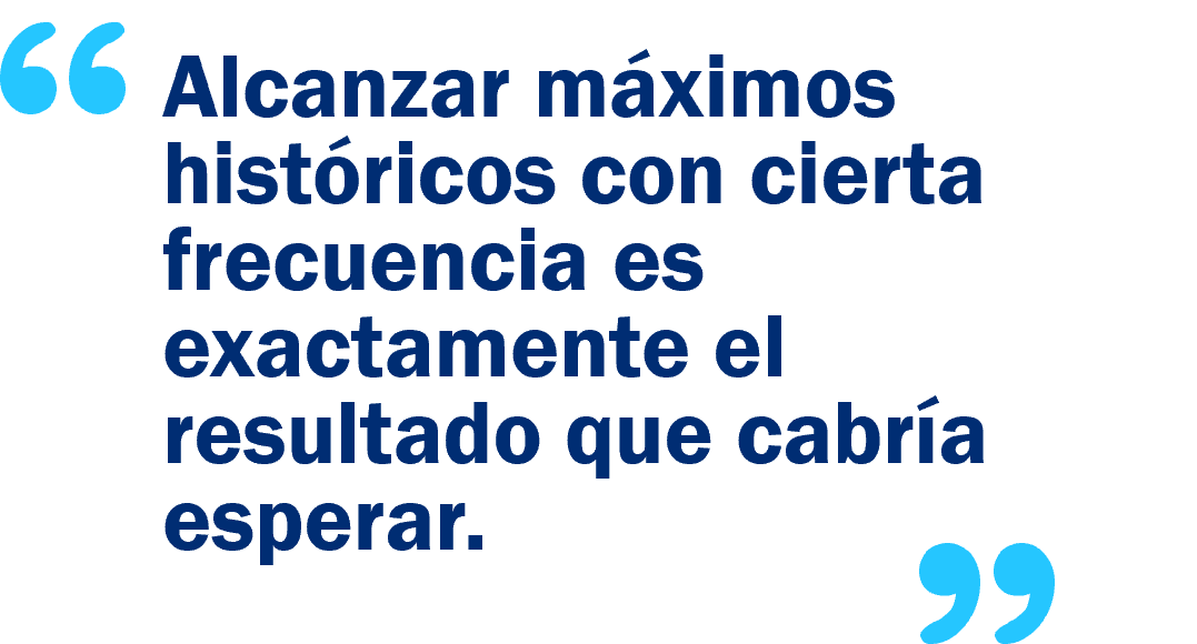 Además, contrariamente a lo que le digan, usted debería tratar los precios máximos históricos con indiferencia. Y ello se debe a que las acciones tienen una rentabilidad esperada positiva, por lo que alcanzar máximos históricos con cierta frecuencia es exactamente el resultado que cabría esperar.