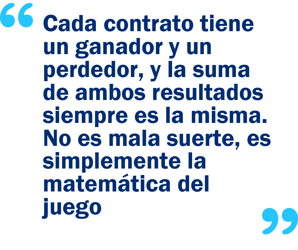 plataformas no está invirtiendo: está participando en un entorno donde el retorno esperado, antes de costos, es cero. Cada contrato tiene un ganador y un perdedor, y la suma de ambos resultados siempre es la misma. No es mala suerte, es simplemente la matemática del juego.