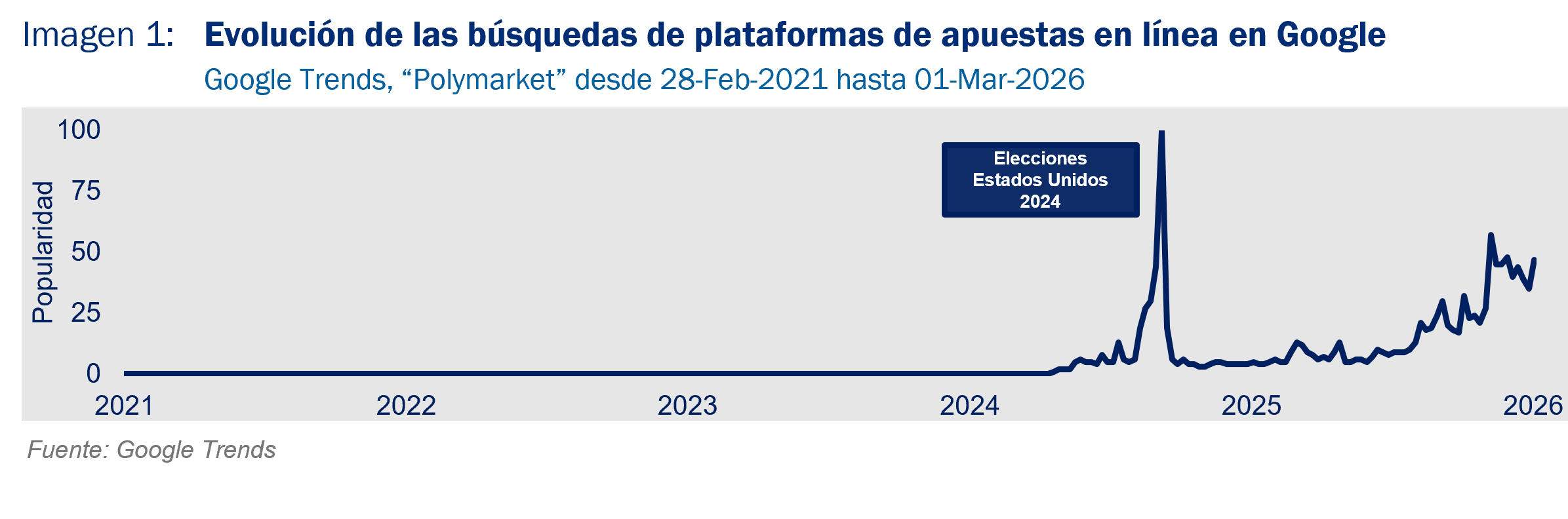 En ese contexto, es probable que haya escuchado hablar de Polymarket o Kalshi (imagen 1). Si no, le contamos que se trata de plataformas de apuestas en línea que van mucho más allá del deporte, permiten apostar sobre resultados electorales, decisiones de política monetaria, cifras macroeconómicas e incluso conflictos geopolíticos. Su premisa central es que los precios son probabilidades, el valor de un contrato refleja la probabilidad que el mercado asigna a que un evento determinado ocurra. Si usted cree que esa probabilidad está subestimada, puede comprar participaciones y ganar si tiene razón. Las plataformas se presentan como sistemas sin casa de apuestas, descentralizadas, donde la inteligencia colectiva de miles de participantes produce estimaciones más precisas que cualquier experto o encuesta tradicional.