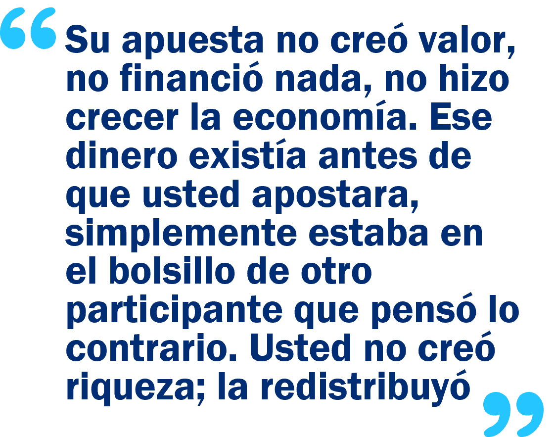 En las apuestas, en cambio, usted no está financiando nada. No hay empresa detrás, no hay flujo de caja, no hay creación de valor. Usted simplemente apuesta a que un evento va a ocurrir antes que otro participante apueste a lo contrario. Para que usted gane, alguien más tiene que perder exactamente lo mismo. Es un juego de suma cero.