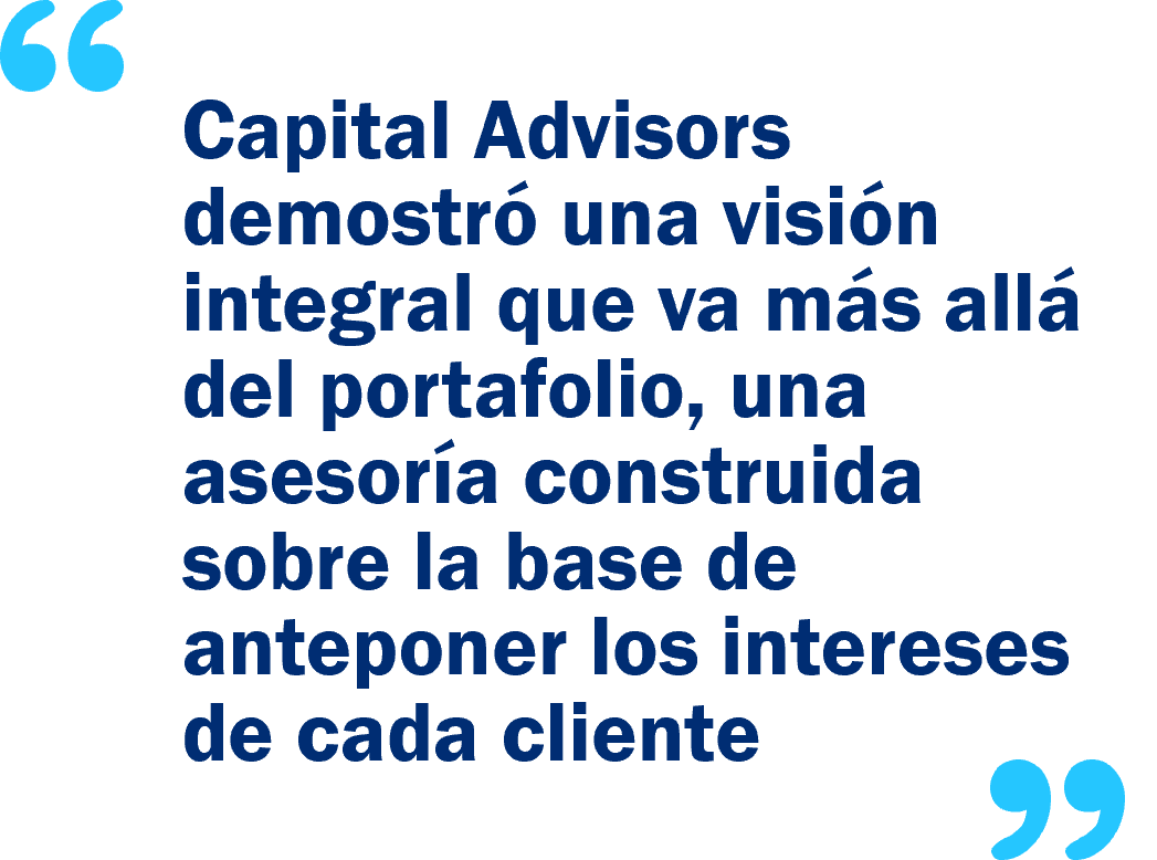 firmas llegaron a la instancia de semifinales, de las cuales CAFO fue seleccionada como la ganadora. En ese proceso, Capital Advisors demostró una visión integral que va más allá del portafolio, una asesoría construida sobre la base de anteponer los intereses de cada cliente y acompañarlos en el cumplimiento de sus objetivos de inversión.